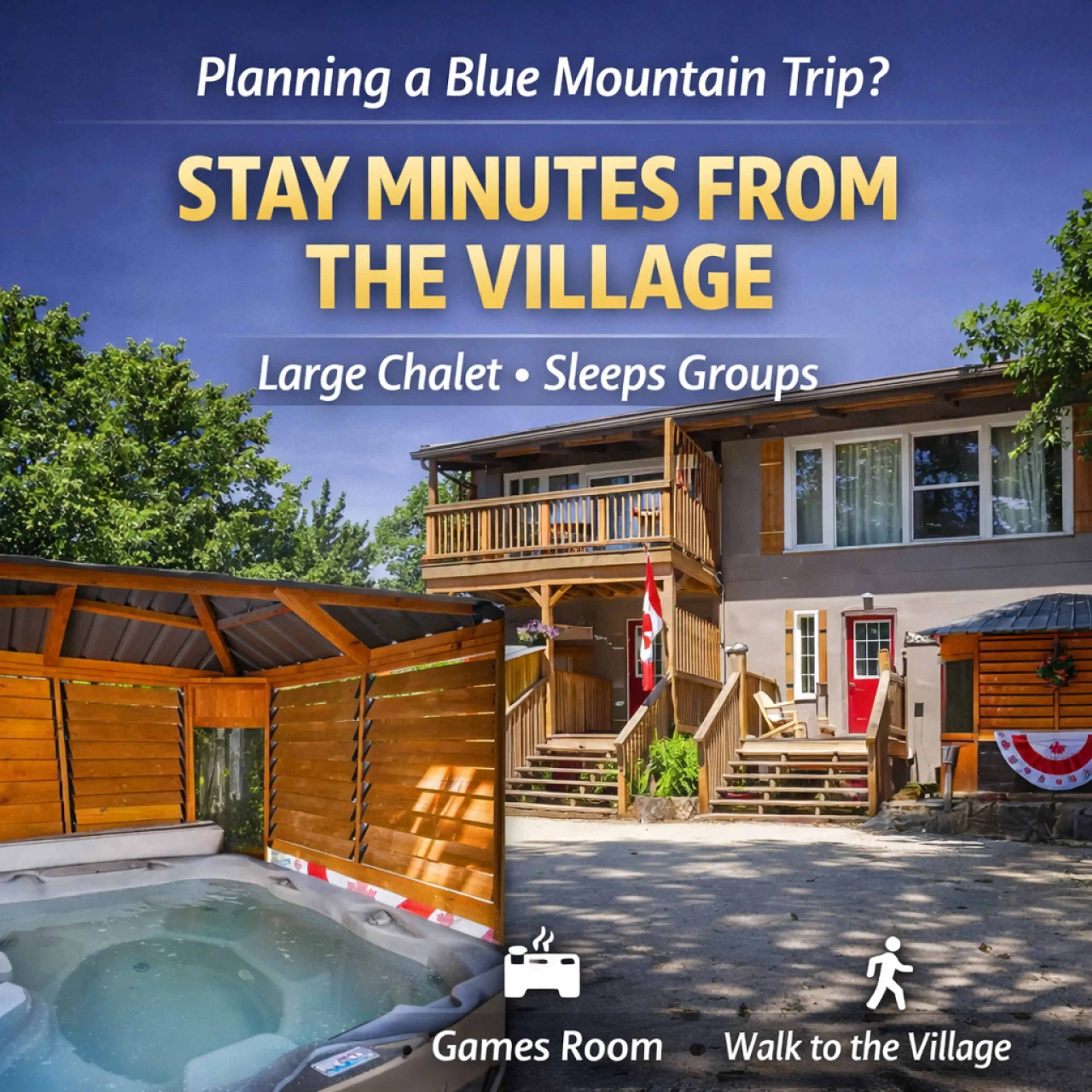 Legendary Tyrolean Village Chalet just 1 km from Blue Mountain Village! Perfect for ski trips, golf weekends, beach days & year-round group getaways. Enjoy 36+ trails, private hot tub, fire pits, Smart TVs, Wi-Fi, BBQ & mountain-view decks. Close to beaches, ropes courses, Collingwood Harbour & Scan...